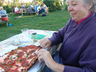 Just outside the back door were picnic tables, with more hidden further out in the orchard. Folks were already there (pizza making starts at 5pm, so many probably had come and gone), and the scene was down home, old hippies and the newer generations, and so pleasant.
